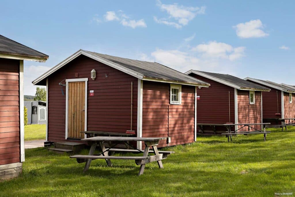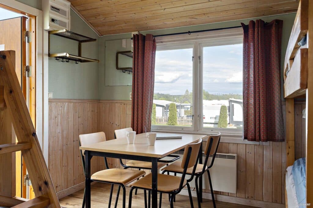 The Fryken Cabin Plus has a 12–15 sqm room furnished with two bunk beds, chairs, and table. There is a kitchenette with refrigerator, hot plate, electric kettle, and basic kitchenware, as well as a container for collecting water. Duvets and pillows are supplied for all beds in the cabin. Shower, toilet, and kitchen are located in the nearby service building.