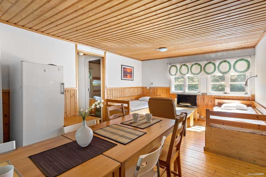Here is a simple and good camping cabin with room for seven beds (80cm). The path is secluded inside the forest and here you live with nature just around the corner. Please note that the toilet and shower are not in the cabin, but you will find them in the service house which is a couple of hundred meters away. In the staircase there is a kitchenette with full kitchen equipment and a TV with basic facilities. Perfect for you who want to relax and take it easy in the evenings. You can easily and conveniently park the car adjacent to the cabin. The cabin is non-smoking but it is allowed to bring pets. Water is available during the summer.